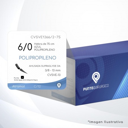 CVSVE1366/2-75 POLIPROPILENO 6/0 Aguja 3/8 - 13 mm Doble Aguja Antirreflejante Negra AHUSADA SUPRAGLYDE DA CVSVE-13 Hebra de 75 cm Uso: Cardiología,Cirugía de Trasplante. C/12. Marca: : Atramat